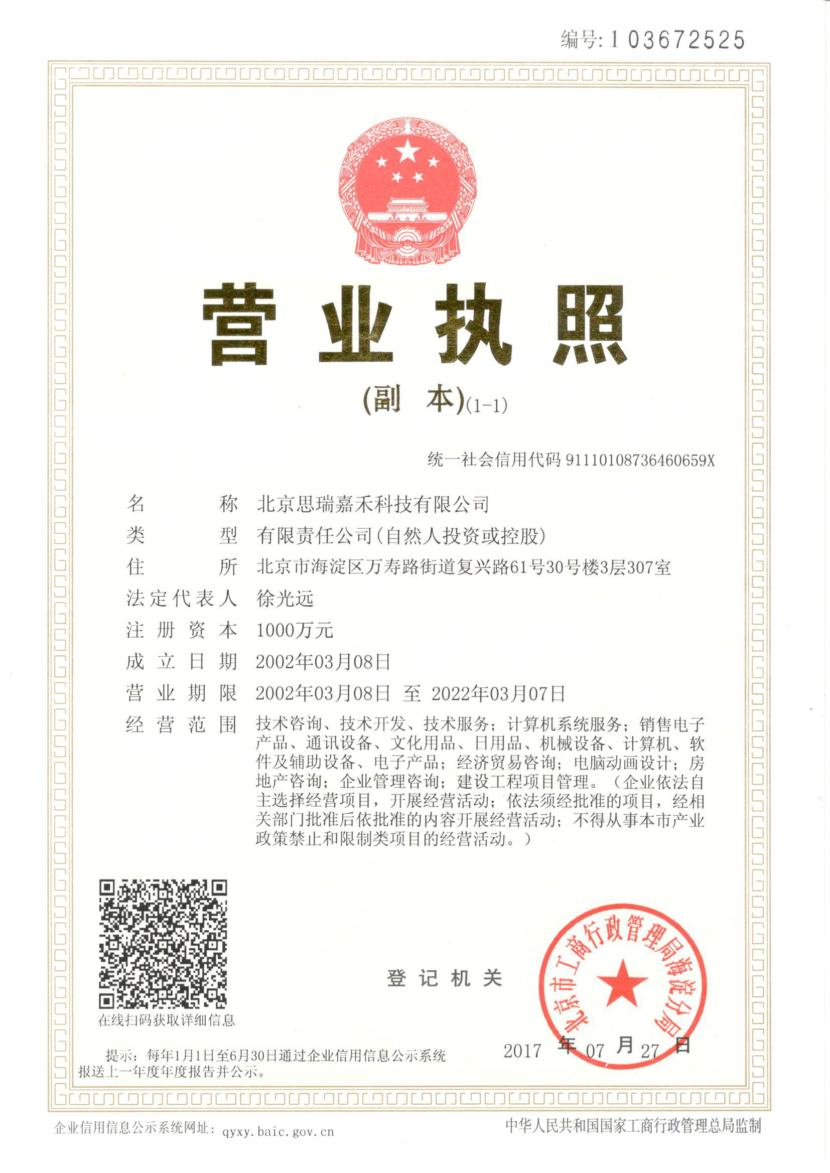 北京思瑞嘉禾科技有限公司成立于2003年。是一家集弱电、计算机系统集成、软件开发、IT外包于一体的高新科技企业。公司长期立足于电力及政府行业,为行业客户提供专业的建筑智能化系统(信息机房建设、综合布线系统、楼宇广播系统、程控交换机系统、安保监控系统、门禁一卡通、机房环境监控系统)和计算机信息系统(计算机系统、网络系统、安全、服务器)等方面的解决方案。公司是信息产业部认定的计算机信息系统集成三级资质企业,信息技术服务运行维护标准三级企业,信息化建设及服务评价三级企业,拥有经验丰富CCIE高级网络工程师,CCNP/CCNA网络工程师、强电工程师、弱电工程师、布线工程师、计算机ITSS运维工程师等,公司核心层都具有长期从事电力、政府相关行业系统集成背景。